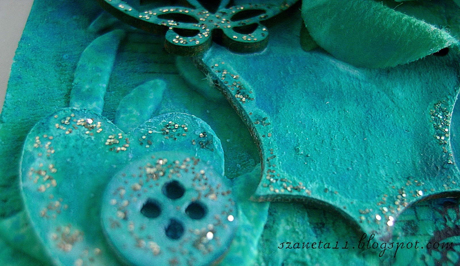 Użyłam dużo gesso , pasty i szablonu , bibuły z nadrukiem nutowym , elementów wycinankowych , kwiatów , nitki , oraz przede wszystkim mgiełek - tutaj tylko dwóch - zieleni i błekitu ( zakupuję mgiełki bardzo powoli i mały mam zasób kolorów na razie ) ,a na koniec brokatu w żelu i stempla.